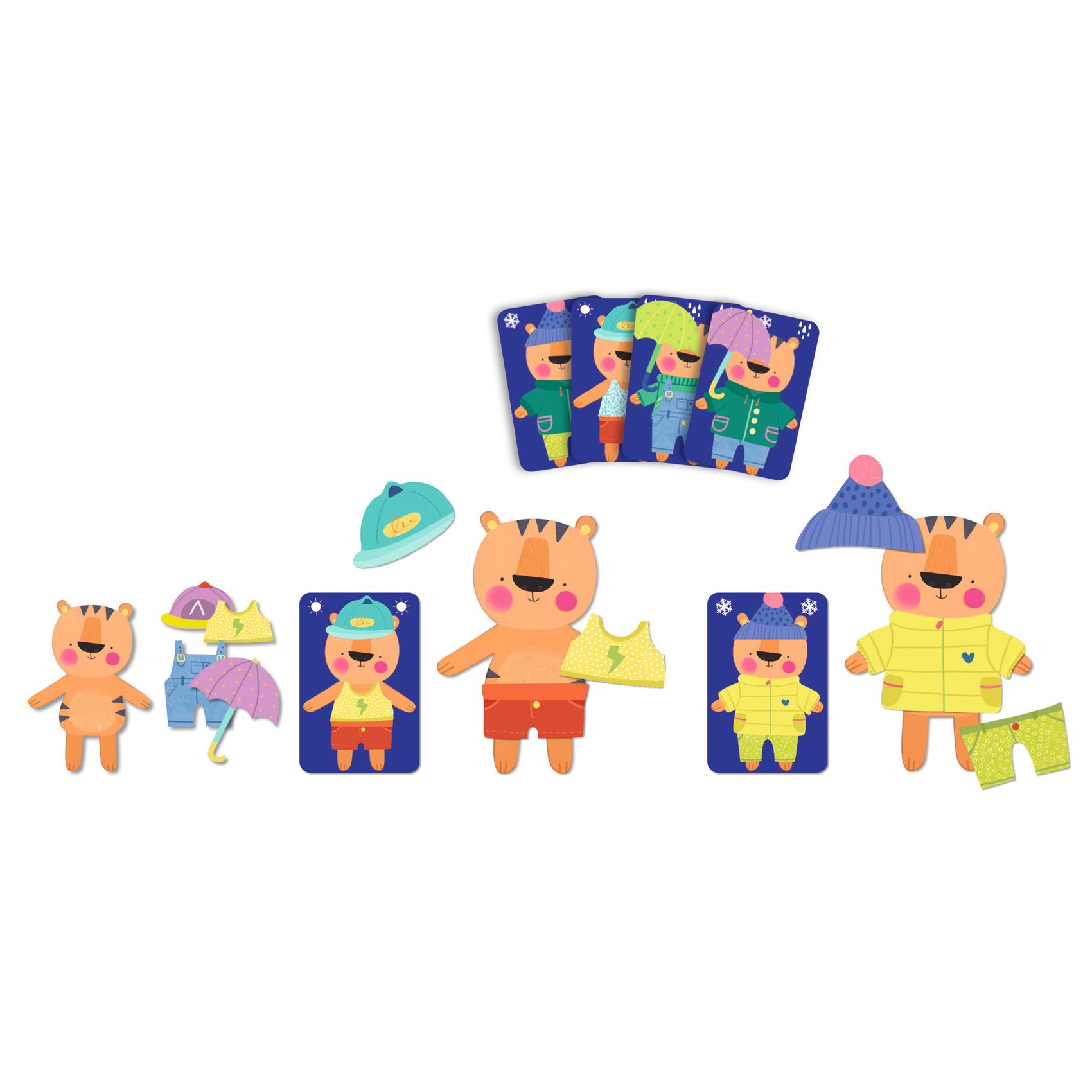 A társasjáték komplex fejlesztő játék, ugyanazon játék közben fejleszti a verbális emlékezetet és a forma felismerést, egyeztetést, figyelmet és a gyors reagálást. Egyszerű játék, a feladatkártyán szereplő kistigrisről az egyik játékos elmondja, megfogalmazza, hogy mit visel, milyen ruha van rajta, a másik játékos ennek megfelelően felöltözteti az öltöztethető tigrisfigurát. A feladatkártya szimbóluma alapján az évszakok megnevezése is lehetséges, így amíg az egyik játékosnak az önkifejező képessége fejlődik, szókincse bővül, addig a másik játékos figyel, majd az elmondottak alapján gyorsan cselekszik. Jó fejlesztő játék logopédiai foglalkozásokhoz is, otthoni mókás játékhoz is.